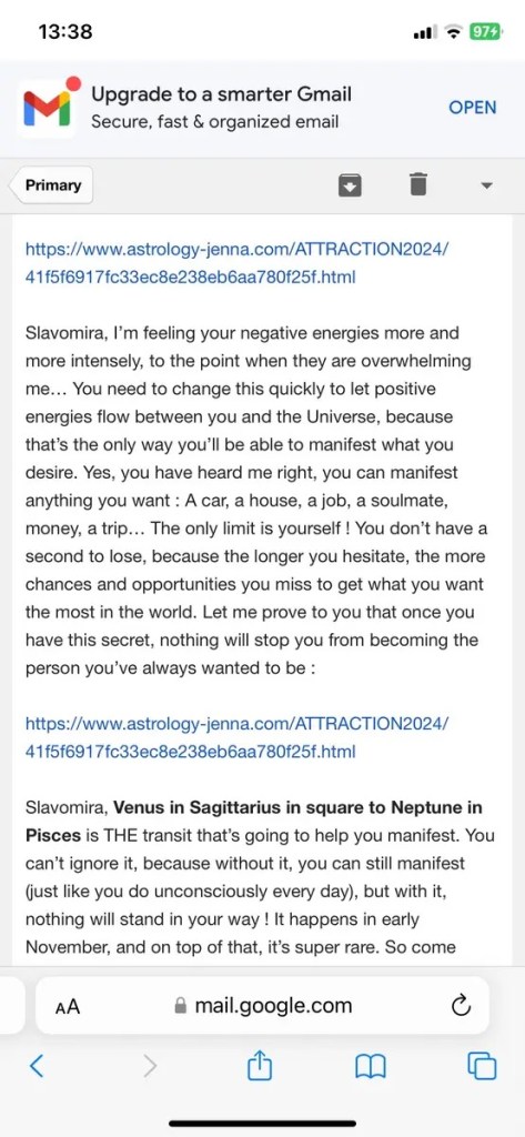 You negative Slavomira Off you go Manifest!!! Money first! And everything else what others think you should have, but you still don’t!! How dare you?!?!! There’s blinking Venus winking at Neptune, what are you waiting for??